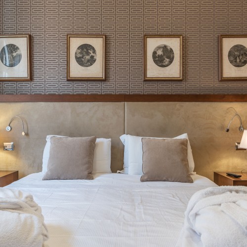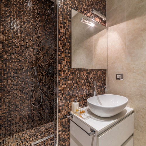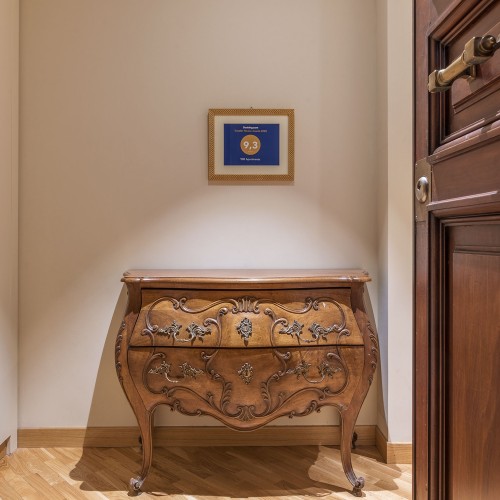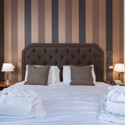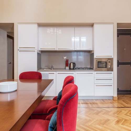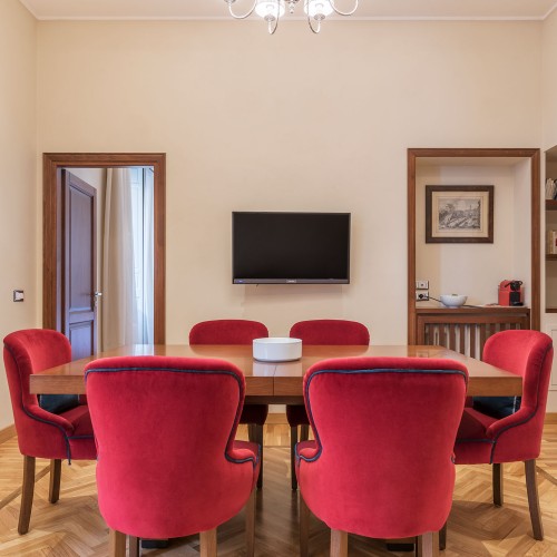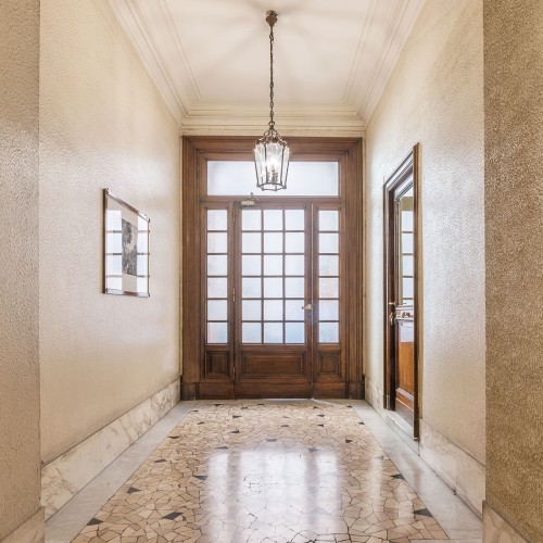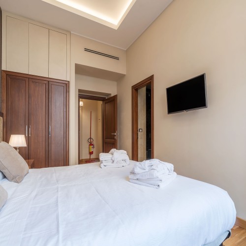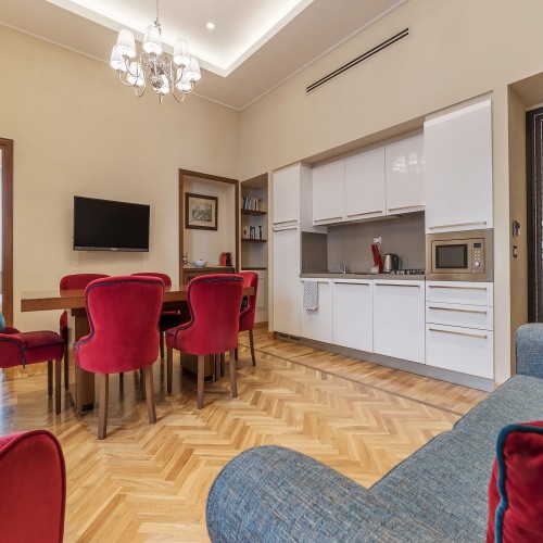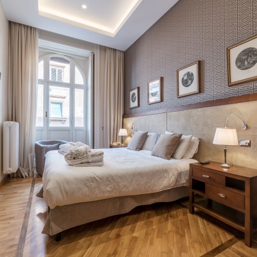 Con due stanze matrimoniali dotate ciascuna di bagno privato, un salotto spazioso ed una superficie totale di 80 metri quadrati, questo appartamento con balconi si affaccia su Via Lazio, tranquilla traversa della nota Via Veneto.