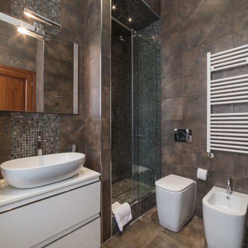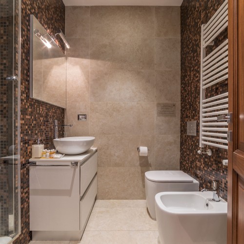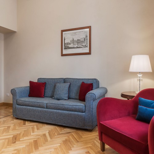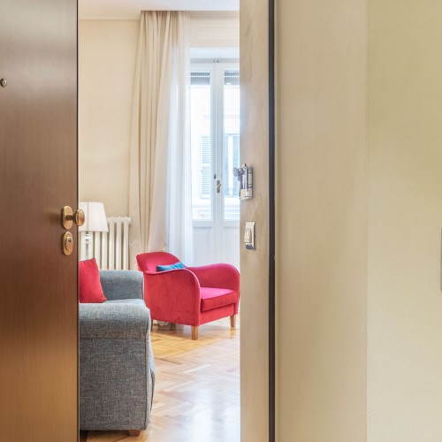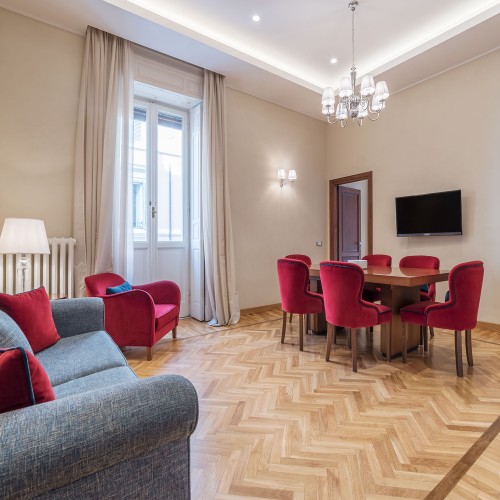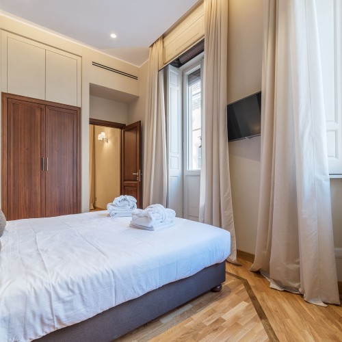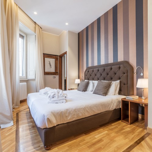 Con due stanze matrimoniali dotate ciascuna di bagno privato, un salotto spazioso ed una superficie totale di 80 metri quadrati, questo appartamento con balconi si affaccia su Via Lazio, tranquilla traversa della nota Via Veneto.